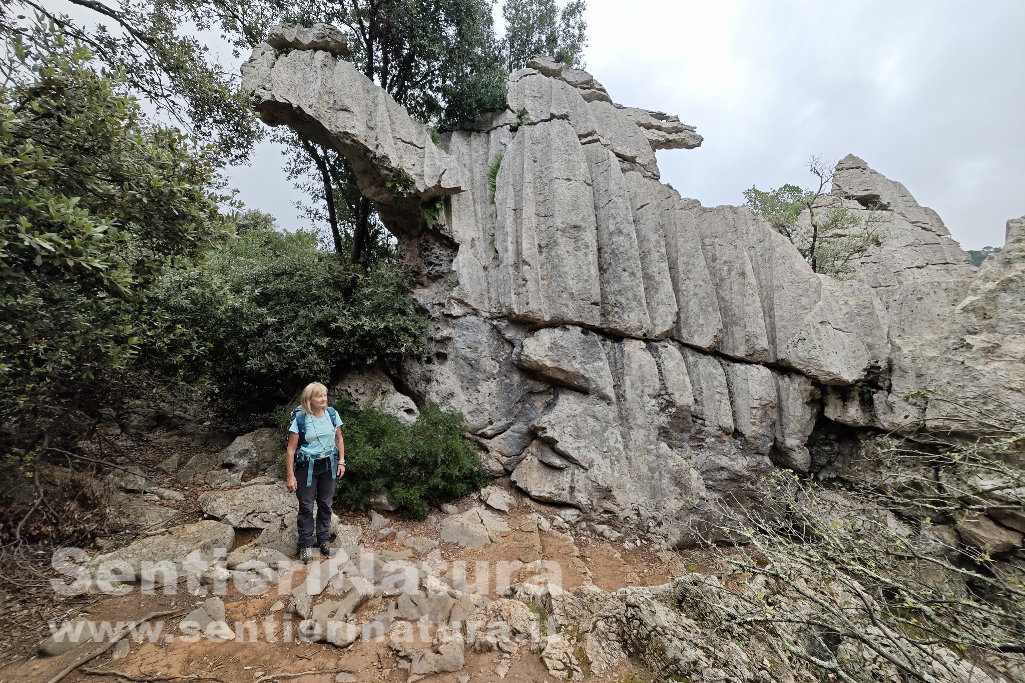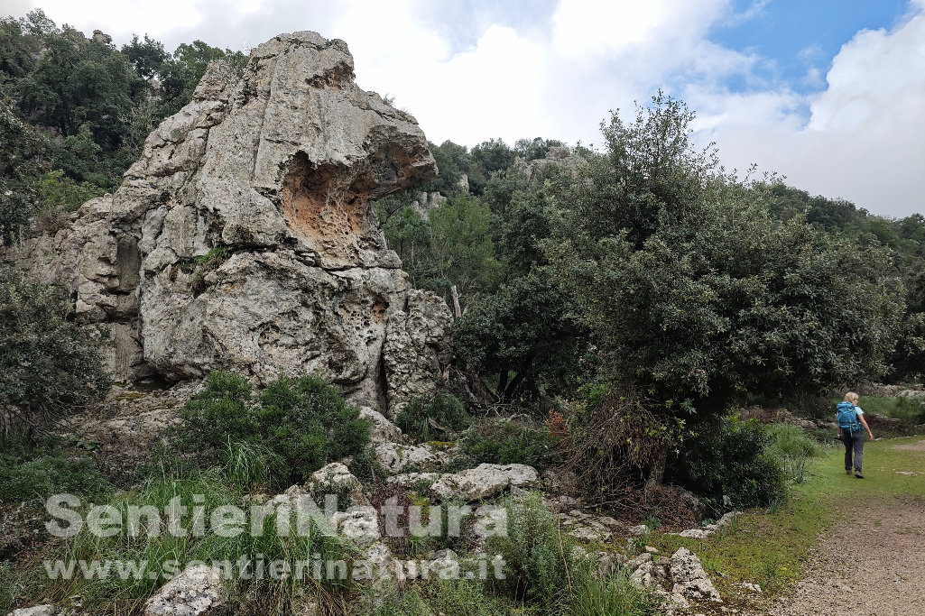 Si sale leggermente all'interno di un vecchio coltivo dove ci colpiscono i tronchi contorti degli olivastri. Arriviamo al belvedere con due muretti-panchina, ma oggi la giornata molto nuvolosa non offre un grande panorama. Da questo punto di colmo, la pista divalla un poco a un bivio. Lasciamo la direzione per Cova de Sa Cometa dels Morts (la valle dei morti) e proseguiamo per il santuario di Lluc e la formazione del Camell, in leggera discesa. Al cartello prendiamo a sinistra per visitare la formazione del Camell (bollo rosso) che raggiungiamo su tavolati carsici affioranti e alcuni gradini. La roccia scolpita dal carsismo ha dato origine a una sagoma impressionante.