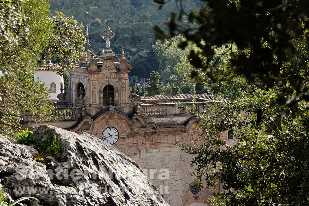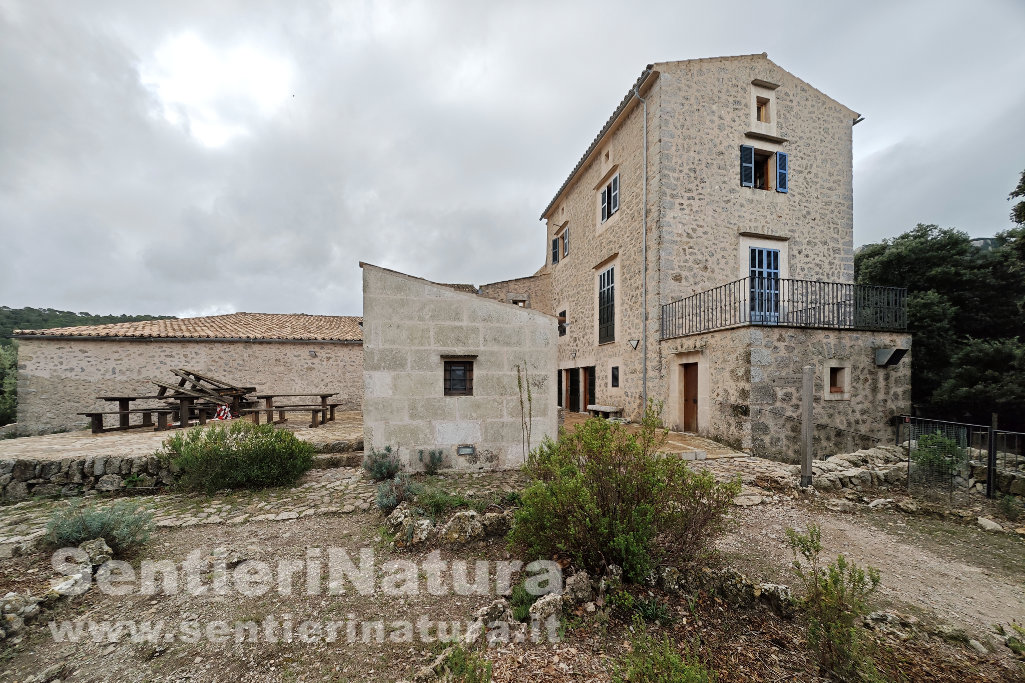 Tornati sui nostri passi proseguiamo a scendere su terreno malagevole, ora reso scivoloso dalla leggera pioggia. Una passerella in legno attraversa il torrente de Lluc e ci porta al bordo del campo sportivo. Attraversiamo il campo di calcio per la sua lunghezza. Usciti dal cancello posteriore raggiungiamo il complesso del Santuario di Lluc, risalente al XIII secolo e meta di pellegrinaggio.