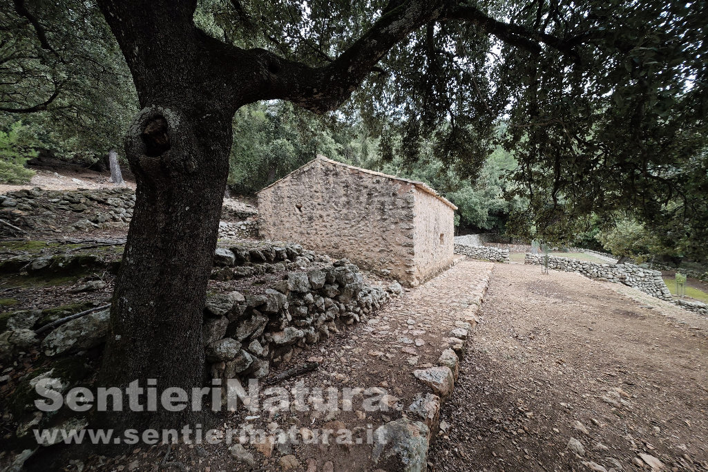 Superato il cancello per capre, la comoda mulattiera lastricata e gradinata sale a comode serpentine in bosco di lecci carsico fino al rifugio Son Amer, con vicino punto di belvedere. Dall'edificio in pietra, a tre piani, fuoriesce ora un invitante odore di cucina.